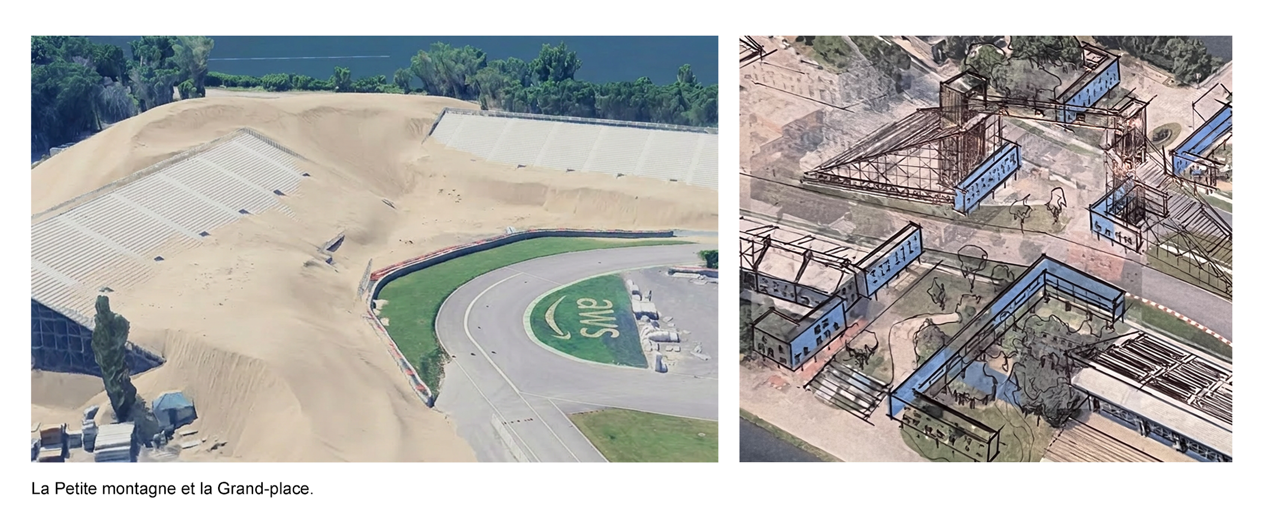 La sinuosité, le caractère lisse en sans aspérité du circuit routier rappellent une forme de glisse, d’organicité. Ils induisent pour le secteur des courbes de Senna la création d’une “petite montagne” : on retrouve ces courbes dans la topographie, les sentiers, l’amphithéâtre naturel et les pistes de glisse.